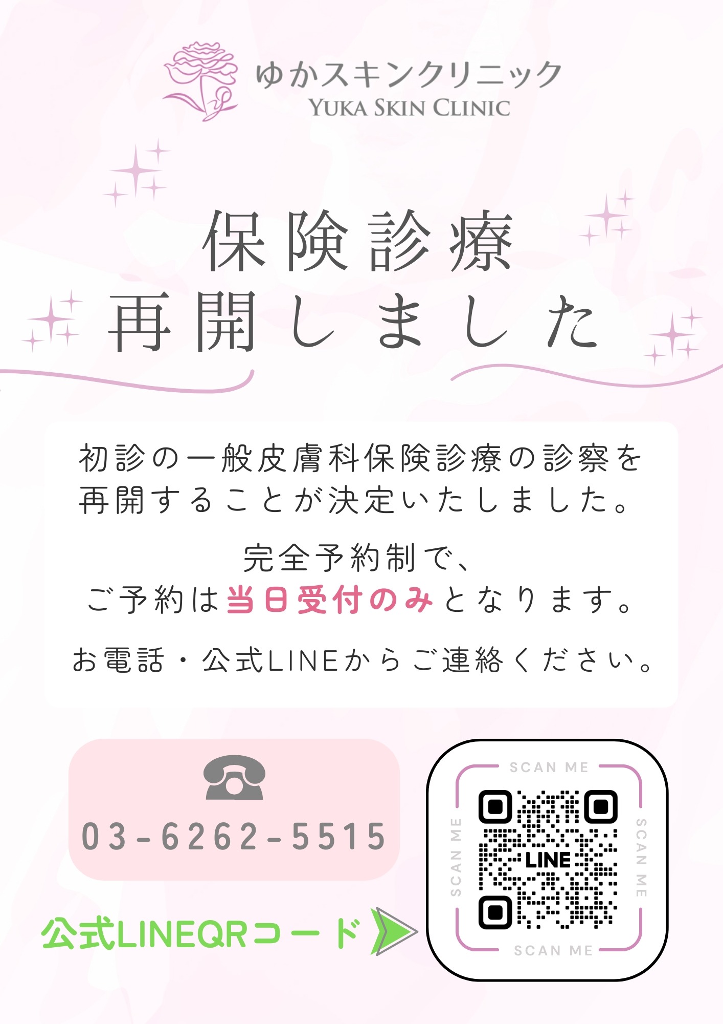 さてさて、本題ですが、ゆかスキンクリニックでは、しばらく停止しておりました皮膚科(保険診療)の新規受付を再開いたしました!